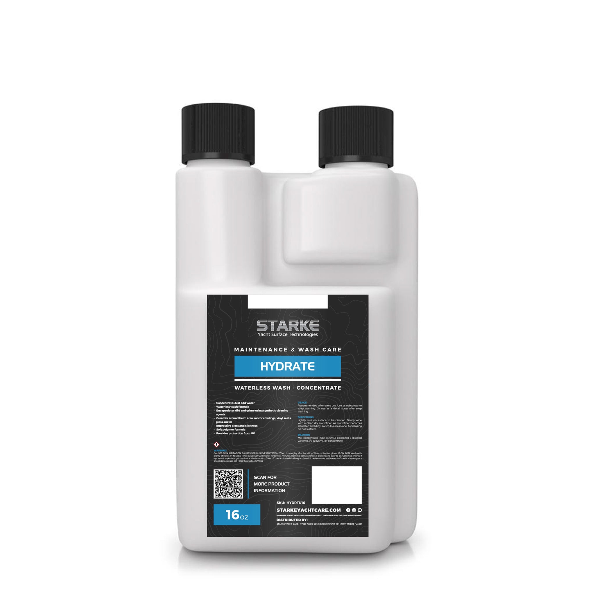 Hydrate Waterless Wash can be used on gel-coat, paint, metal and plastic. This formula uniquely encapsulates dirt and grime while leaving a soft polymer to provide protection, extreme slickness and improving depth of gloss. Great to use in substitute of a soap wash. The concentrate yields 16 oz. of RTU for every 3/4 oz. of concentrate.